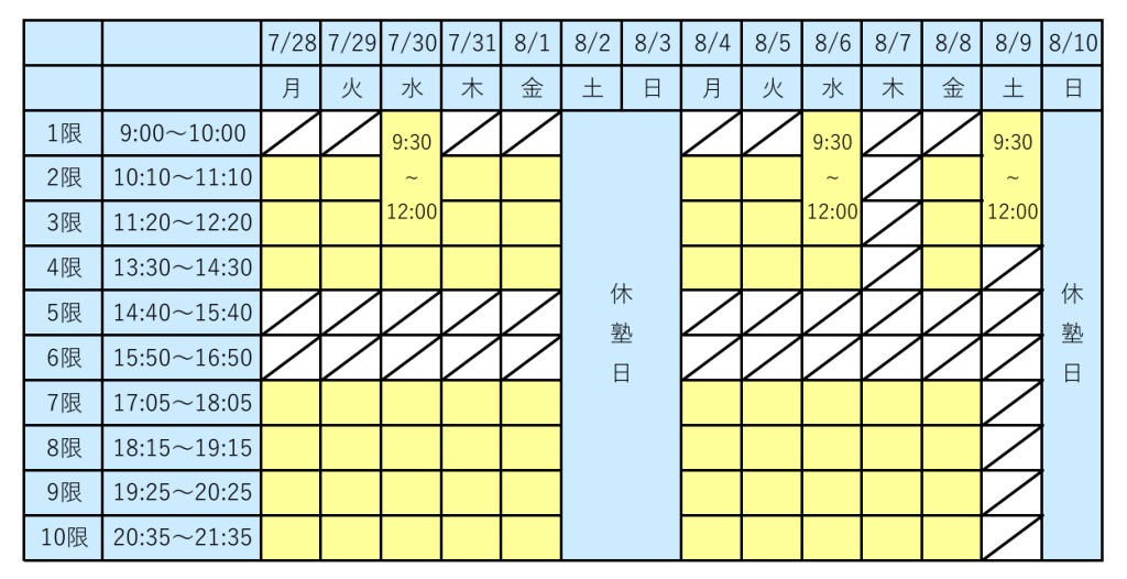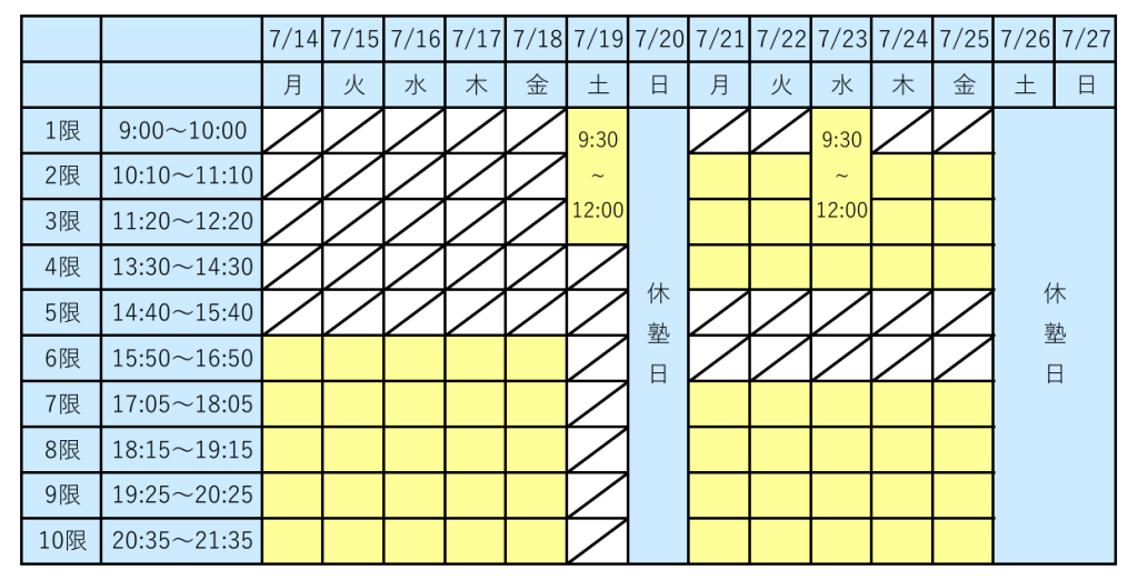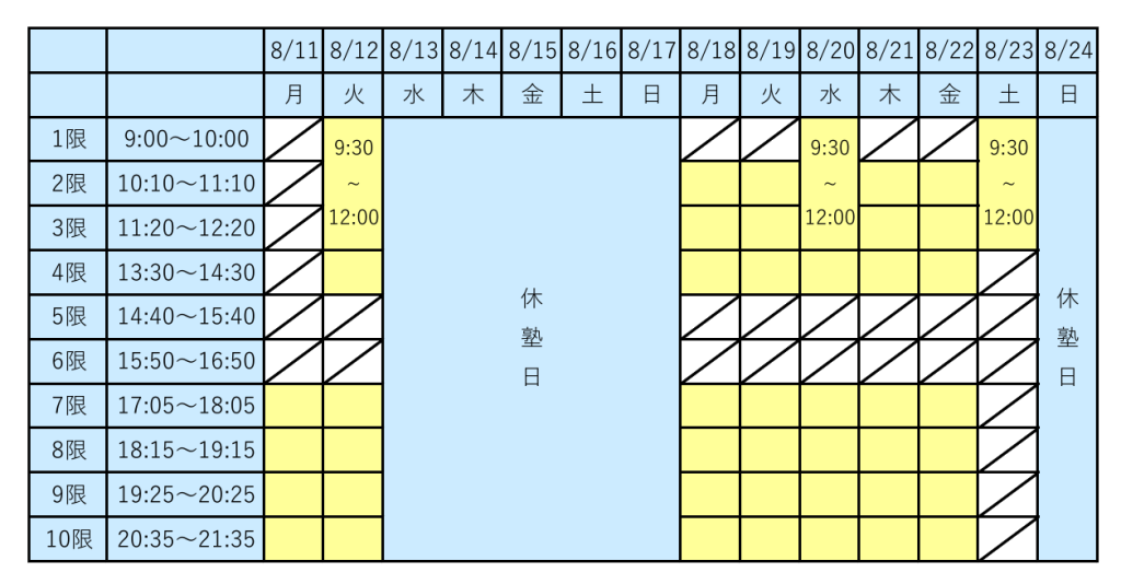 スケジュールの黄色の時間帯は、塾を開けています。