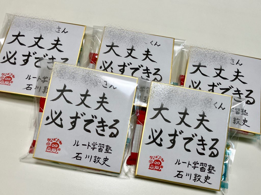 学習会の締めくくりには、直前期の過ごし方を話し、激励メッセージとお守りをお渡ししました。